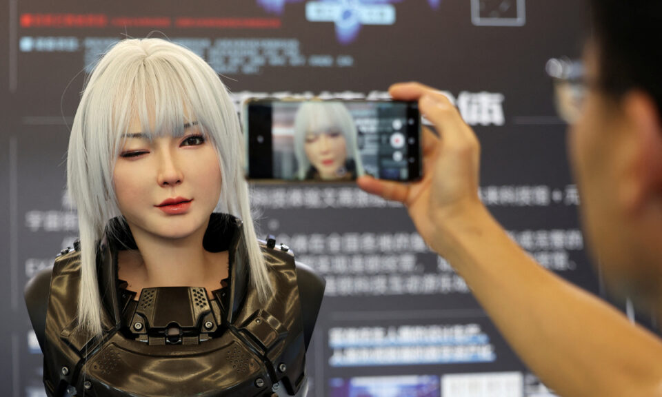 Một robot hình người do Ex-Robots phát triển đang nháy mắt, tại Hội nghị Robot thế giới ở Bắc Kinh, Trung Quốc. Ảnh: REUTERS/Florence Lo