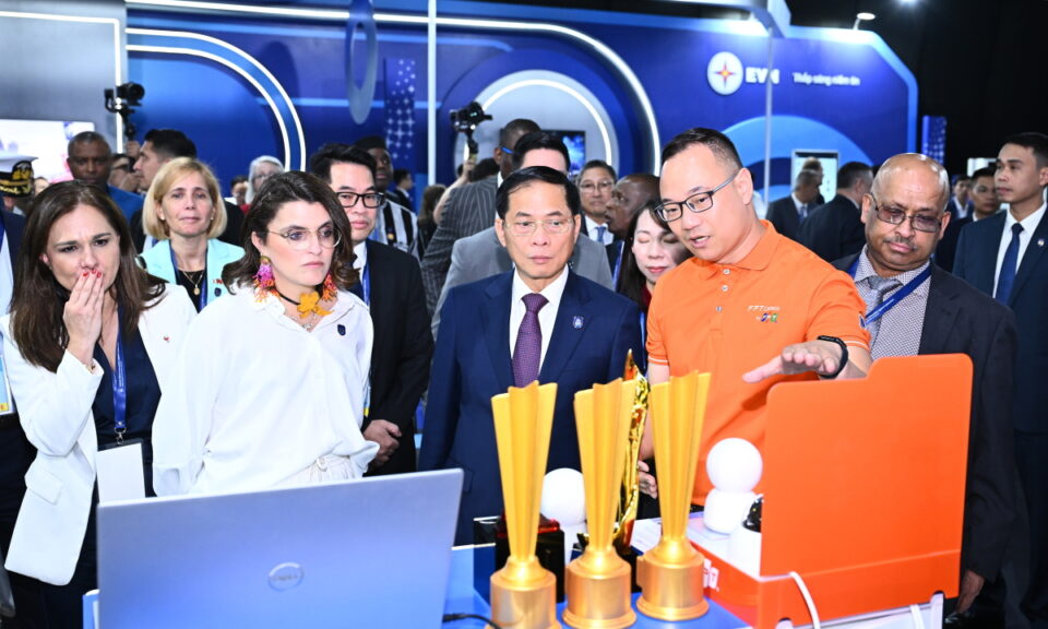 Phó Thủ tướng Bùi Thanh Sơn (thứ hai từ trái) và Phó Tổng thống Ecuador María José Pinto (trái) nghe đại diện FPT giới thiệu nền tảng bảo mật ứng dụng AI. Ảnh: FPT