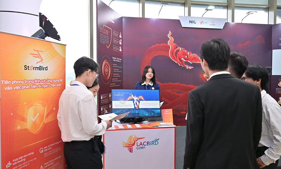 Gian hàng của Lacbird tại sự kiện giới thiệu các giải pháp an ninh mạng và AI từ Stormbird. Đây là nền tảng về công nghệ chống bot tự động tại Việt Nam, cung cấp các giải pháp bảo mật, bảo vệ hệ thống trực tuyến khỏi tấn công DDoS.