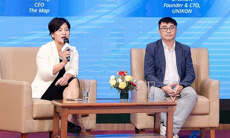 Bà Đỗ Thùy Dương – CEO The Map (trái) và ông Đinh Trần Tuấn Linh – nhà sáng lập Unikon (phải) tại sự kiện. Ảnh: MSD
