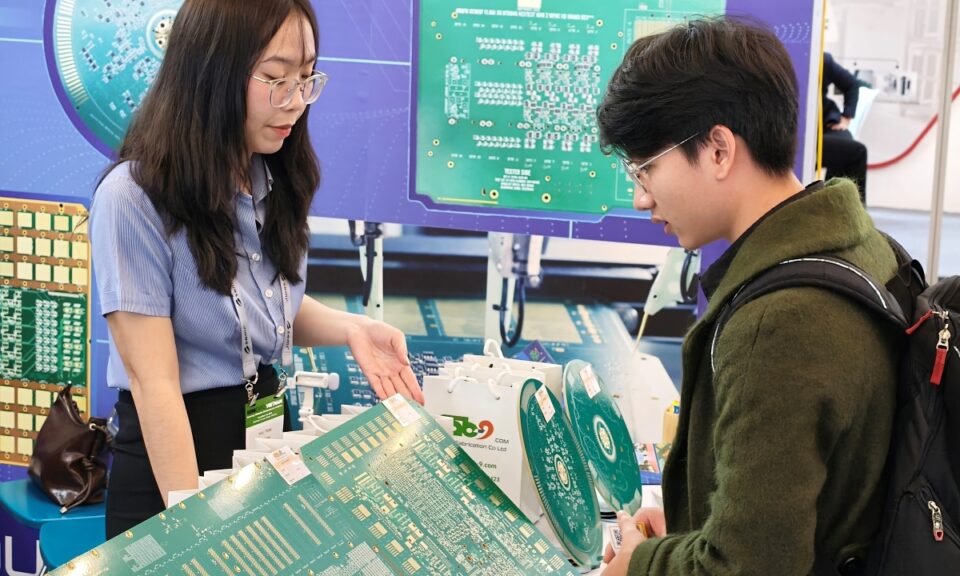 Khách tham quan đang xem một bảng mạch in tại triển lãm Semi Expo 2005. Ảnh: Trọng Đạt