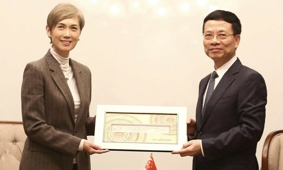 Bộ trưởng Nguyễn Mạnh Hùng tặng quà lưu niệm là một bộ tem Việt Nam cho Bộ trưởng Phát triển Kỹ thuật số và Thông tin Singapore, sáng 16/1. Ảnh: Doãn Mạnh