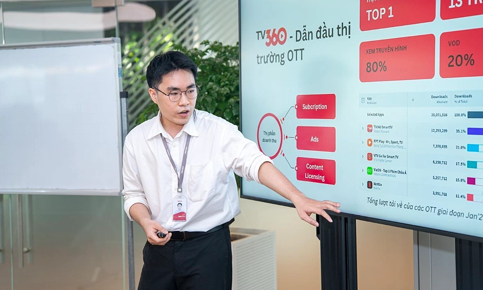 Ứng viên chương trình Viettel Future Changemakers trình bày ý tưởng cho sản phẩm TV360 trước hội đồng chuyên môn. Ảnh: Viettel